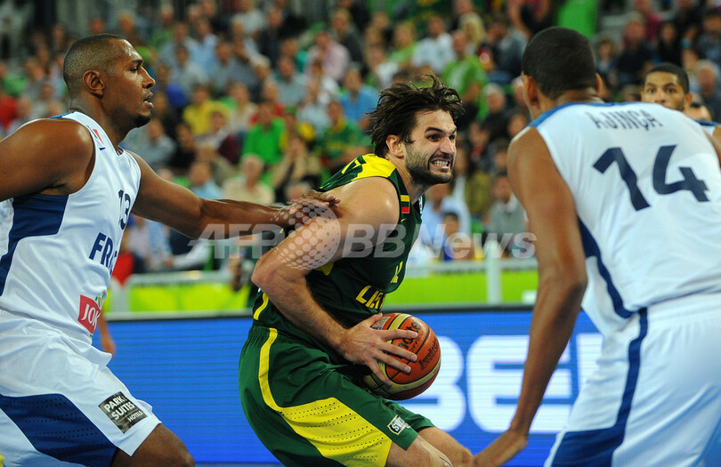 フランスのボリス・ディーオウ(Boris Diaw、左)らのマークを受けるリトアニアのリーナス・クレイザ(Linas Kleiza、中央、2013年9月22日撮影)。(c)AFP/ANDREJ ISAKOVIC
