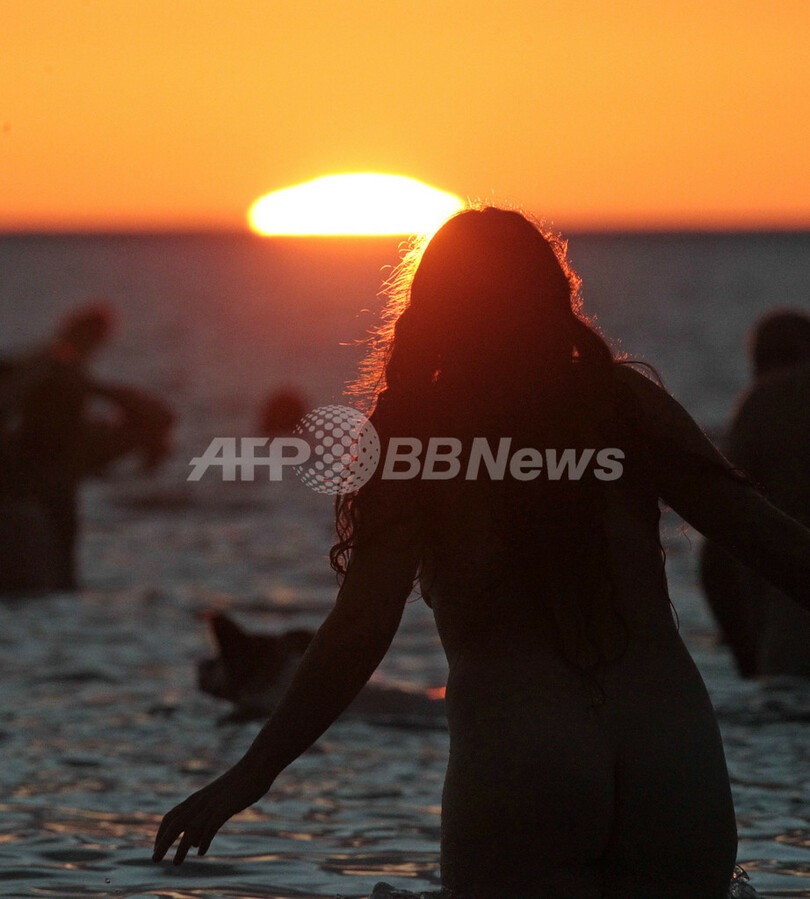 朝日を浴びて200人が全裸海水浴、英国