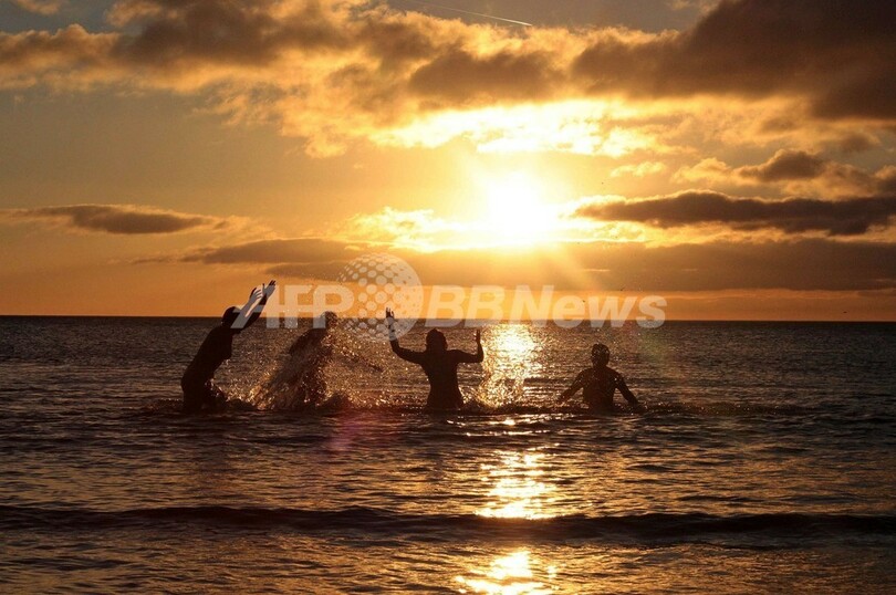 朝日を浴びて200人が全裸海水浴、英国