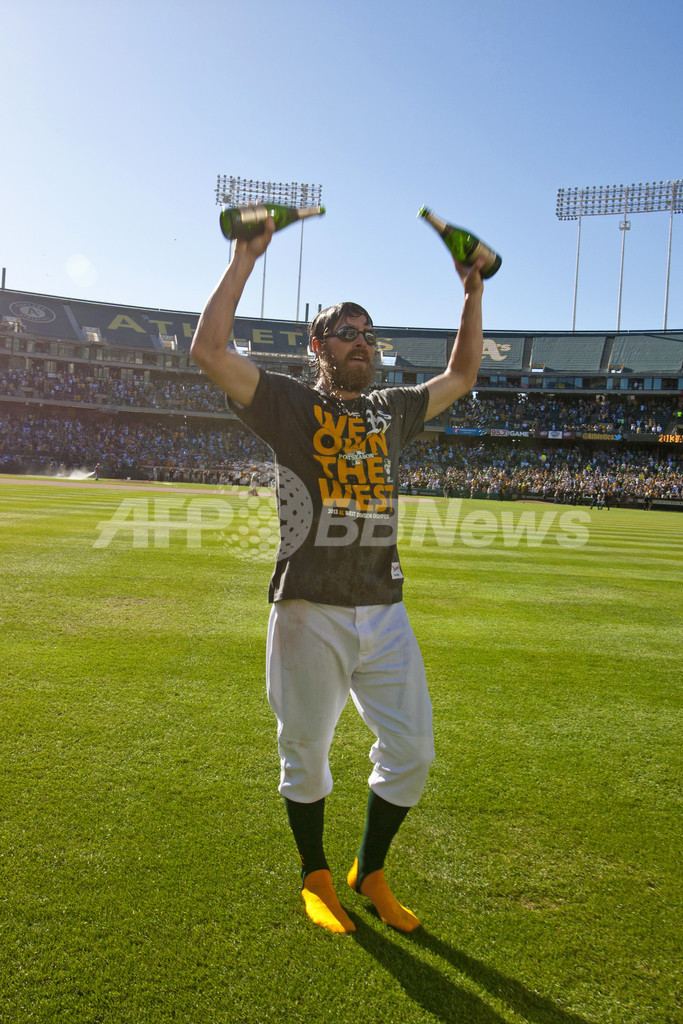 同日行われた試合でテキサス・レンジャーズ(Texas Rangers)がカンザスシティ・ロイヤルズ(Kansas City Royals)に0-4で敗れたため、アスレチックスが通算16度目の地区優勝、25度目のプレーオフ進出を決めた。(c)AFP