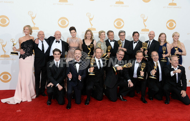 【9月23日 AFP】米ロサンゼルス(Los Angeles)で22日、第65回プライムタイム・エミー賞(Primetime Emmy Awards)授賞式が行われ、内気な高校の化学教師がある事をきっかけに麻薬密売に手を染めていく姿を描く「ブレイキング・バッド(Breaking Bad)」がドラマ・シリーズ部門作品賞に選ばれた。コメディー・シリーズ部門の作品賞は、「モダン・ファミリー(Modern Family)」が4年連続で受賞した。