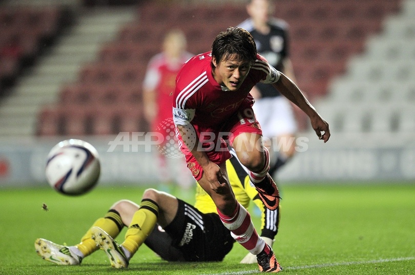 ブリストル・ロバーズのGKエリオット・パリッシュ(Elliot Parish、奥)をかわすサウサンプトンの李忠成(Tadanari Lee、2013年9月24日撮影)。(c)AFP/GLYN KIRK