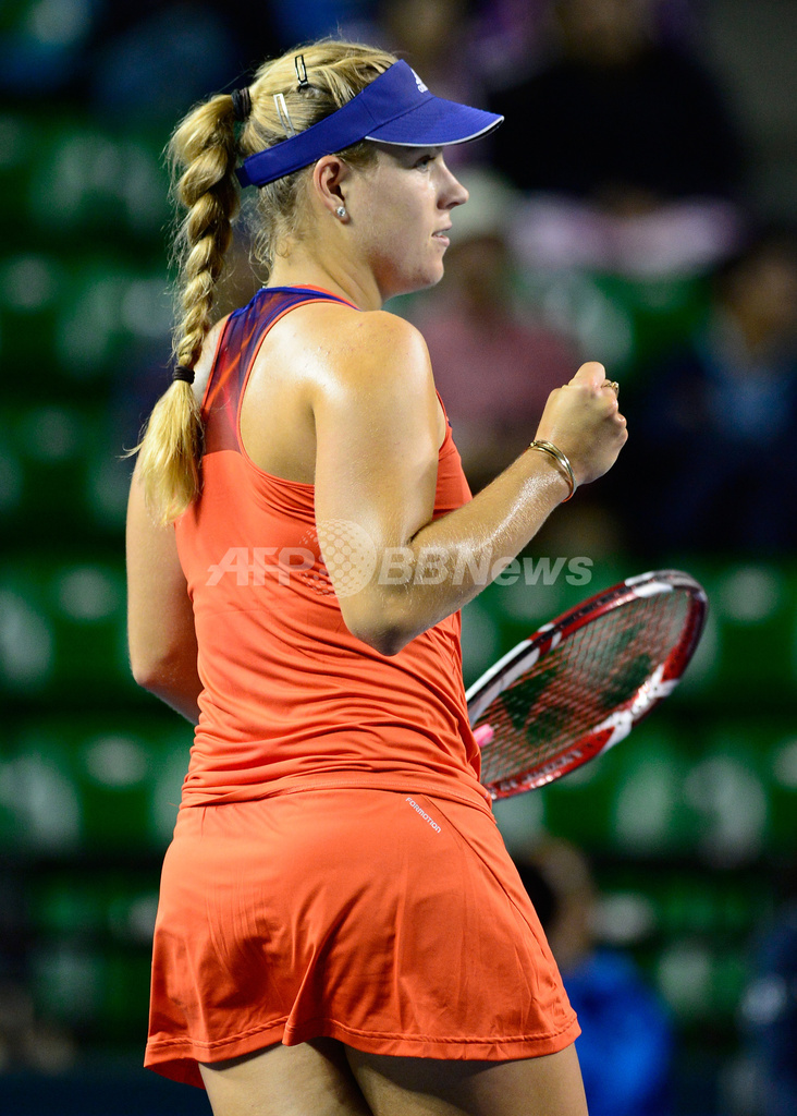 ポイントを奪い、ガッツポーズを見せるアンゲリク・ケルバー(2013年9月23日撮影)。(c)AFP/Toru YAMANAKA