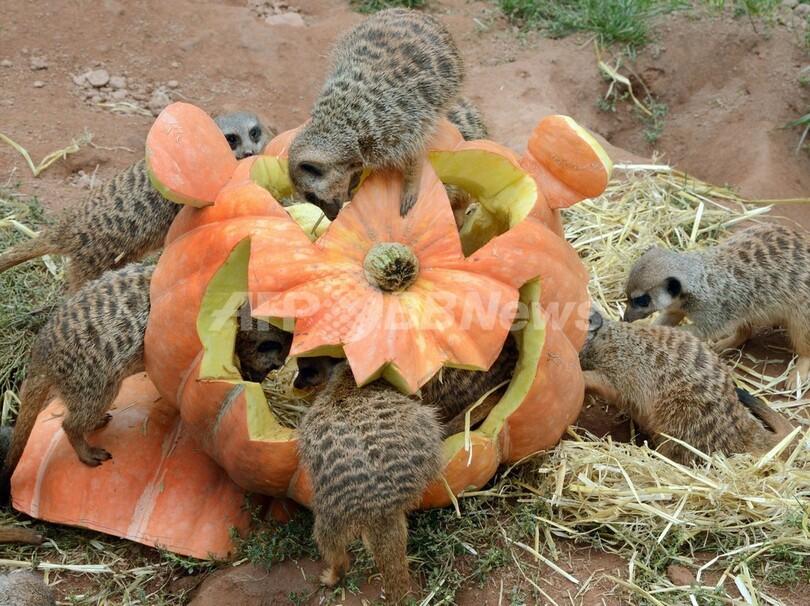 【9月26日 AFP】ドイツ東部ライプチヒ(Leipzig)の動物園で、ハロウィーンの飾り用にくりぬかれたカボチャの中から顔を出すミーアキャットたち。間もなく迎えるハロウィーンの季節に合わせ、ワラや好物の虫が入ったカボチャが置かれ、ミーアキャットだけでなく来園者たちも楽しませた。(c)AFP