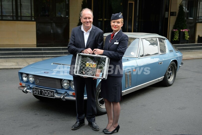 写真は、「ソロ」初版を持って車の前でポーズを取るボイド氏(左)とブリティッシュ・エアウェイズ(British Airways、BA)の客室乗務員(右、2013年9月25日撮影。(c)AFP/Leon Neal