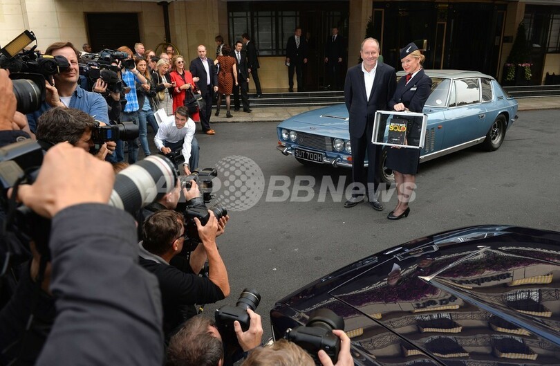 写真は、「ソロ」初版を持って車の前でポーズを取るボイド氏(左)とブリティッシュ・エアウェイズ(British Airways、BA)の客室乗務員(右、2013年9月25日撮影。(c)AFP/Leon Neal