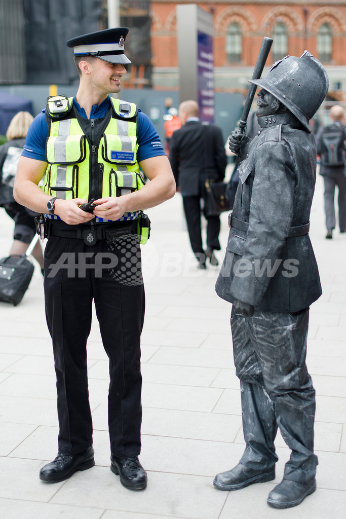 【9月27日 AFP】英ロンドン(London)中心部のキングスクロス(Kings Cross)駅前に26日、再開発によって新しく「キングズクロス広場(King's Cross Square)」が誕生した。オープニングを祝い、広場にはこの日、シャーロック・ホームズ(Sherlock Holmes)やビクトリア女王(Queen Victoria)、キーストン警官(Keystone Cops)などの「生ける銅像」が出現。道行く人々の目を楽しませた。(c)AFP