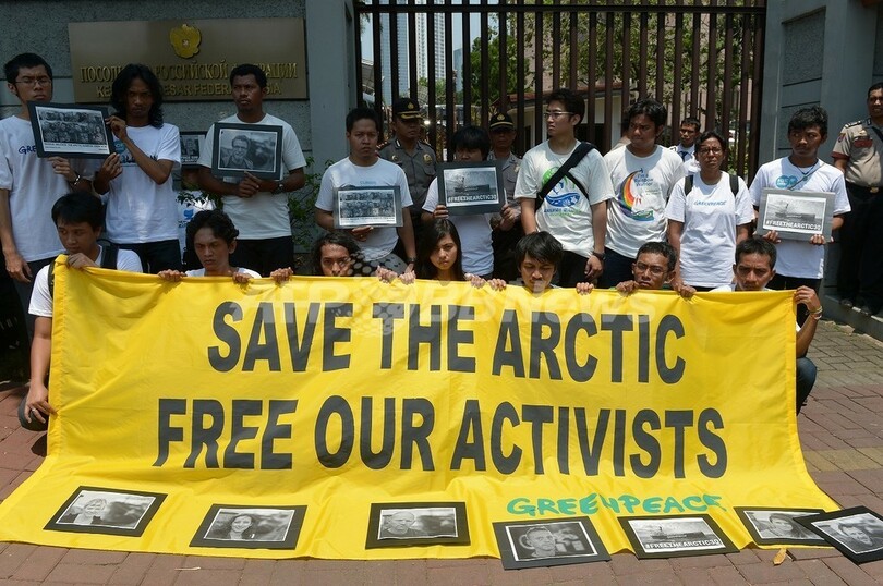 活動家ら30人が乗った同団体の抗議船「アークティック・サンライズ(Arctic Sunrise)」は19日、北極圏のバレンツ海(Barents Sea)最南部のペチェラ海(Pechora Sea)で石油採掘に対する抗議行動中に、乗り込んできたロシア当局の武装部隊によって拿捕(だほ)され、北西部ムルマンスク(Murmansk)にえい航された。前日にはメンバー2人が、国営エネルギー大手ガスプロム(Gazprom)所有の石油プラットフォームによじ登って侵入を試みたことから、ロシアの沿岸警備隊に一時身柄拘束された。