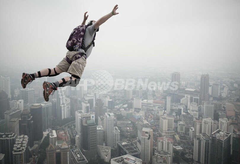 写真は、タワーから飛び降りたベースジャンパーたち(2013年9月27日撮影)。(c)AFP/MOHD RASFAN
