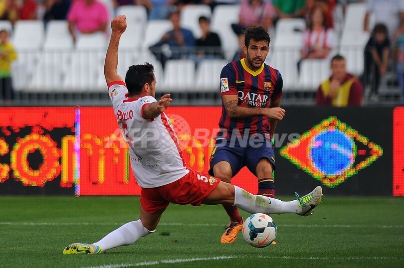 アルメリアのアンヘル・トルヒーリョ(Angel Trujillo、手前)とボールを競るFCバルセロナのセスク・ファブレガス(Cesc Fabregas、2013年9月28日撮影)。(c)AFP/JORGE GUERRERO