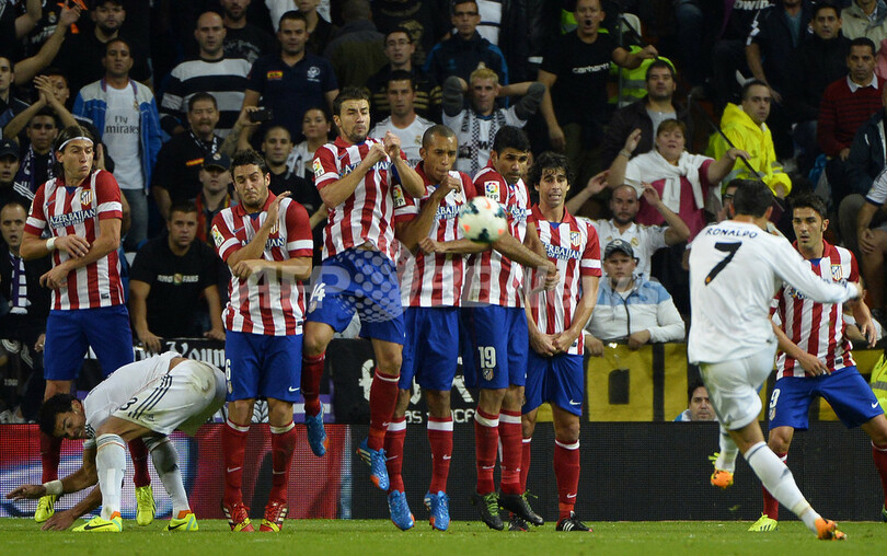 FKを蹴るレアル・マドリードのクリスティアーノ・ロナウド(Cristiano Ronaldo、右、2013年9月28日撮影)。(c)AFP/GERARD JULIEN