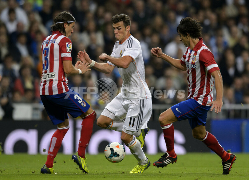アトレティコ・マドリードのフィリペ・ルイス・カスミルスキ(Filipe Luis Kasmirski、左)とボールを競るレアル・マドリードのギャレス・ベイル(Gareth Bale、中央、2013年9月28日撮影)。(c)AFP/DANI POZO