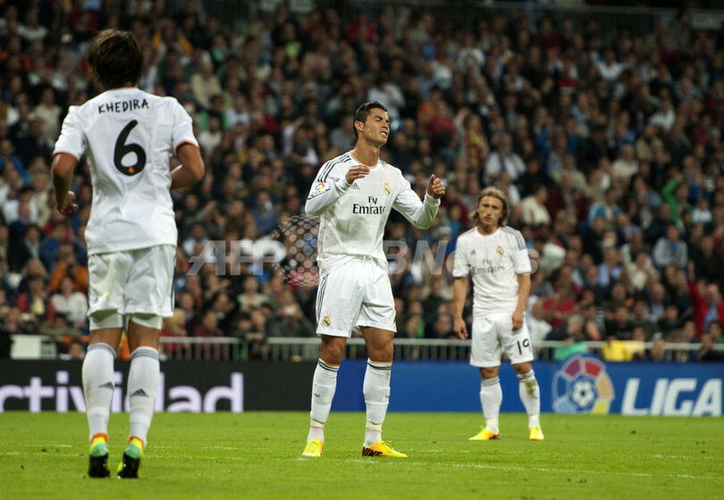 試合中、落胆した様子を見せるレアル・マドリードのクリスティアーノ・ロナウド(Cristiano Ronaldo、中央、2013年9月28日撮影)。(c)AFP/DANI POZO