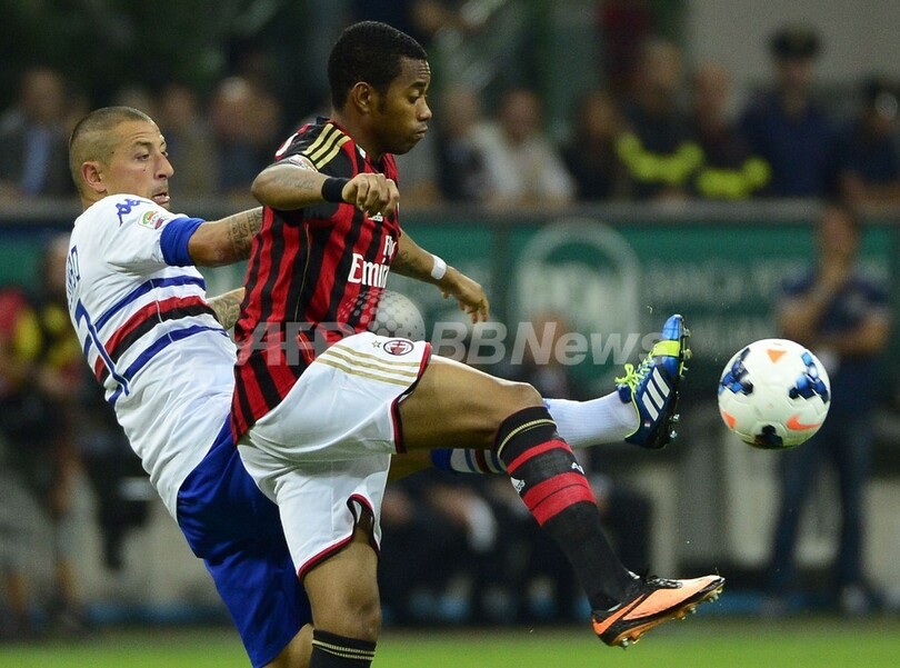 サンプドリアのアンジェロ・パロンボ(Angelo Palombo、左)とボールを競るACミランのロビーニョ(Robinho、2013年9月28日撮影)。(c)AFP/OLIVIER MORIN