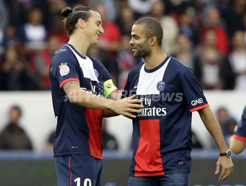 スタジアムに姿を見せたプロバスケットボール選手のトニー・パーカー(Tony Parker、右)を迎えるPSGのズラタン・イブラヒモビッチ(Zlatan Ibrahimovic、2013年9月28日撮影)。(c)AFP/KENZO TRIBOUILLARD