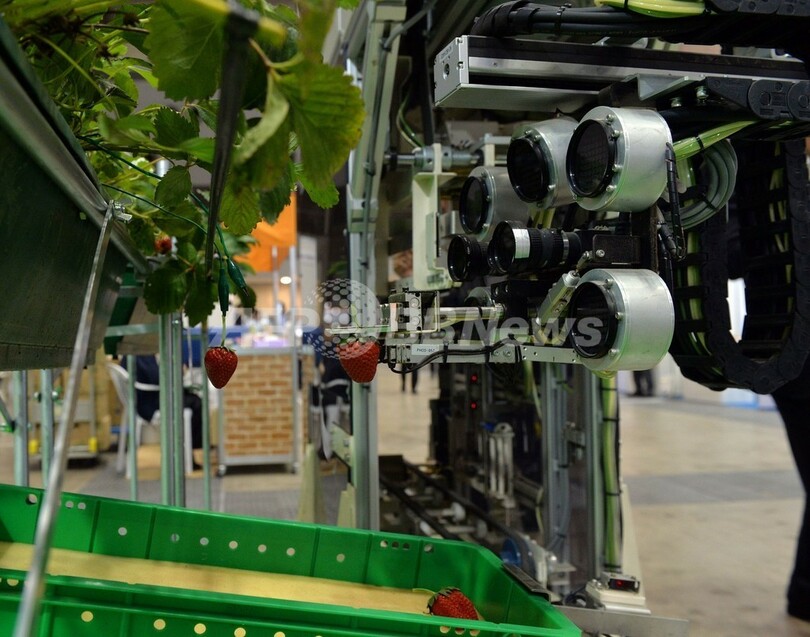 【9月26日 AFP】農家の人たちが眠っている間に熟したイチゴを収穫してくれるロボットが25日、都内で開催された自動認識総合展(AutoID and Communication Expo)で公開された。開発者によると、農家の作業量は3分の2に軽減されるという。