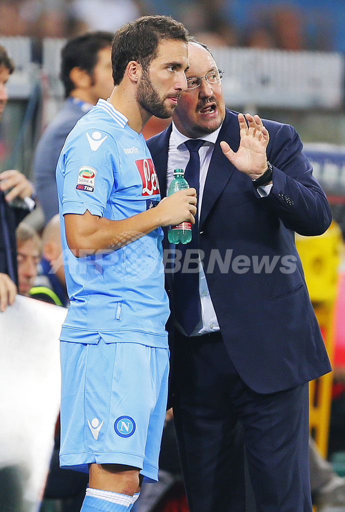 試合中ゴンサロ・イグアイン(Gonzalo Higuain、左)に話をするナポリのラファエル・ベニテス(Rafael Benitez)監督(2013年9月28日撮影)。(c)AFP/FABIO MUZZI