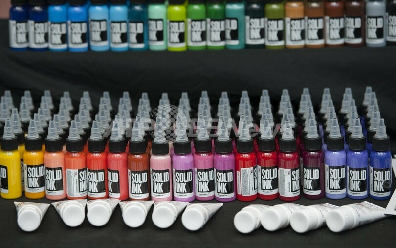 写真は、「ロンドン・タトゥー・コンベンション」の会場で、販売用に並べられたタトゥー用のインク(2013年9月29日撮影)。(c)AFP/WILL OLIVER
