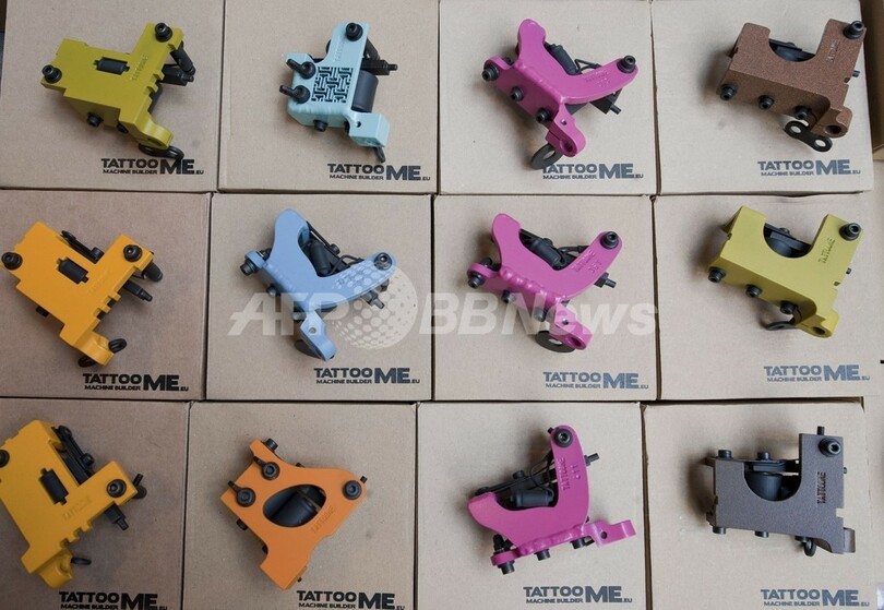 写真は、「ロンドン・タトゥー・コンベンション」の会場で展示された、タトゥーを彫る道具(2013年9月29日撮影)。(c)AFP/WILL OLIVER