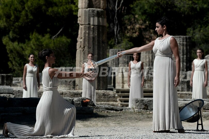 2600年前のヘラ神殿の遺跡で、古代ギリシャの衣装をまとった俳優はまばゆい太陽の下でアポロ(Apollo)神に祈りを捧げると、凹面鏡で太陽光を集めてたいまつに火をともした。
