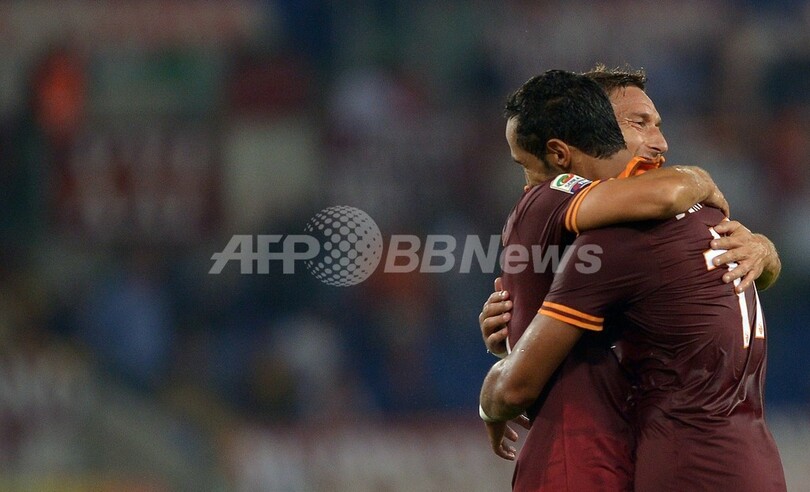 得点を決めたメディ・ベナティア(Mehdi Benatia、右)を祝福するASローマのフランチェスコ・トッティ(Francesco Totti、2013年9月29日撮影)。(c)AFP/FILIPPO MONTEFORTE