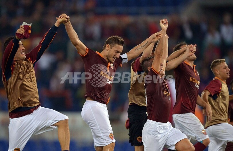 勝利を喜ぶフランチェスコ・トッティ(Francesco Totti、左から2人目)らASローマの選手(2013年9月29日撮影)。(c)AFP/FILIPPO MONTEFORTE