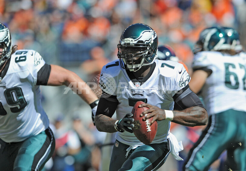 パスを狙うフィラデルフィア・イーグルスのマイケル・ヴィック(Michael Vick、2013年9月29日撮影)。(c)AFP/Getty Images/Dustin Bradford