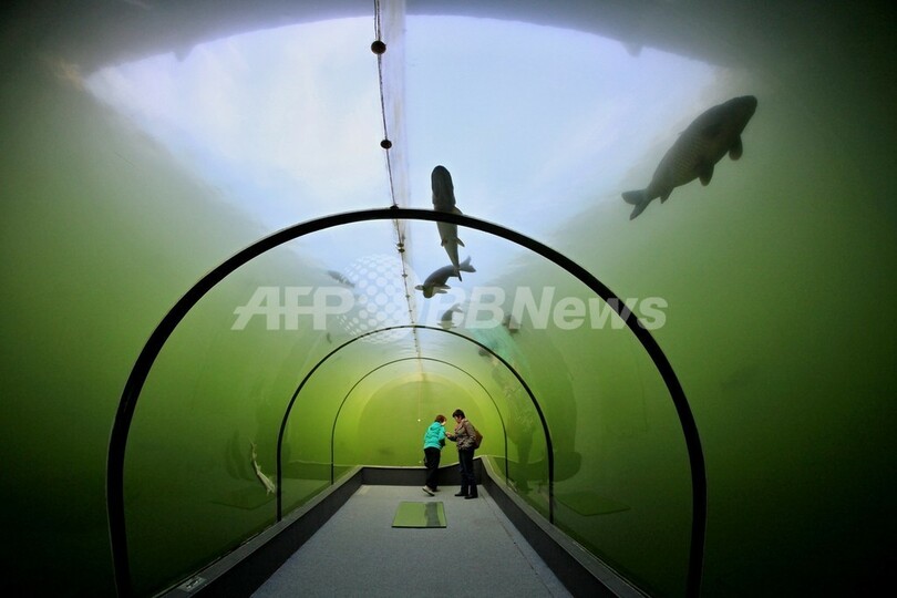 【10月3日 AFP】チェコ・南モラバ(South Moravia)州の都市ブルノ(Brno)から南東へ70キロほど離れたマドラ(Madra)には、湖の中に作られた透明な壁を持つトンネルがある。長さ8メートルほどのこのトンネルは、深さ3メートルの位置にあり、窓の外を泳ぐチョウザメやコイ、ナマズ、マスやウナギなどを観察することができる。(c)AFP