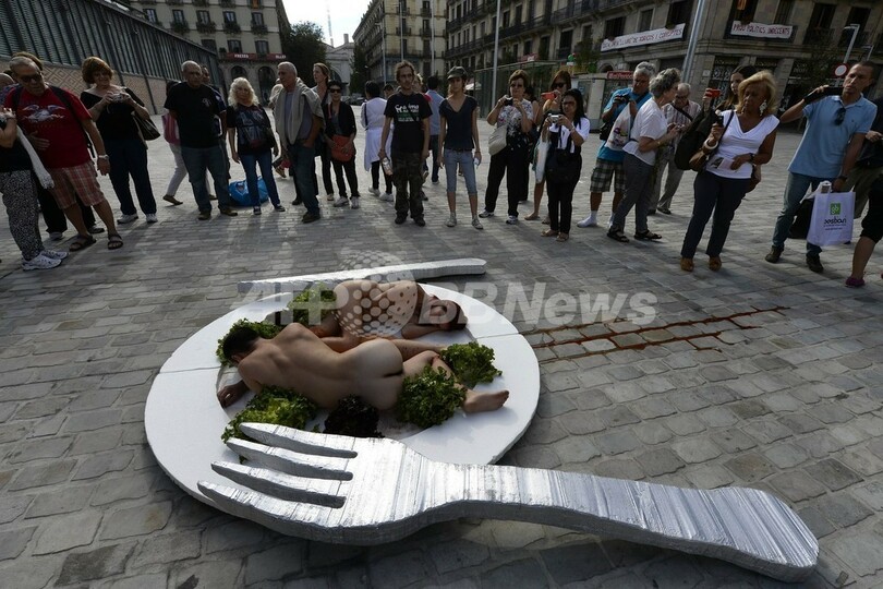 【10月3日 AFP】「世界ベジタリアンの日(World Vegetarian Day)」の2日、スペイン・バルセロナ(Barcelona)で動物保護団体「アニマ・ナチュラリス(AnimaNaturalis)」のメンバーが、裸で巨大な皿の上に乗って肉食に対する抗議デモを行った。