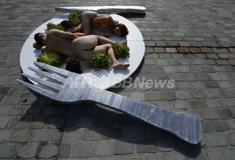 メンバーらは裸の男女が盛り付けられた皿の前で「あなたはどれだけの残忍さをのみ込めるのか?」との抗議文を掲げ、肉を食べる習慣を非難した。(c)AFP