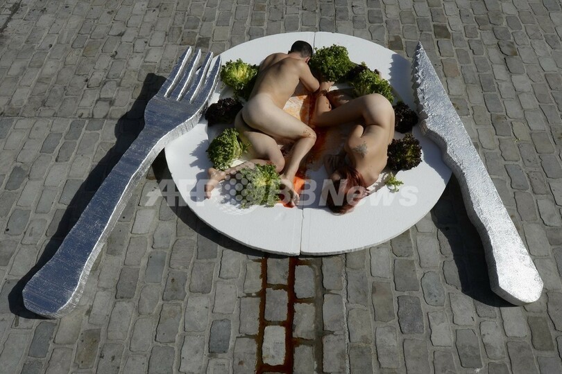 メンバーらは裸の男女が盛り付けられた皿の前で「あなたはどれだけの残忍さをのみ込めるのか?」との抗議文を掲げ、肉を食べる習慣を非難した。(c)AFP