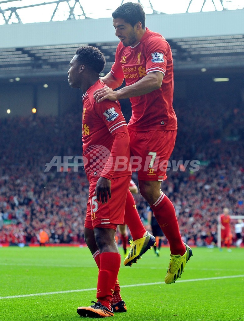 手をつけられない状態のストライカー2人と、リーグ通算99ゴール目を決めたジェラードの活躍で、ブレンダン・ロジャーズ(Brendan Rodgers)監督率いるリバプールは2位のアーセナル(Arsenal)に勝ち点1差をつけた。