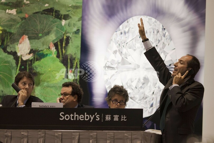 ニュース ライフ 118カラットのホワイトダイヤに史上最高額、香港 2013年10月8日 8:40 発信地:香港 このニュースをシェア ‹ › ❮ 3/7 ❯ 香港(Hong Kong)にて行われたホワイトダイヤのオークションで、新記録となる3060万ドル(約29億7000万円)で落札した入札者の代理人(右、2013年10月7日撮影)。(c)AFP/ANTHONY WALLACE 画像作成中 ! 【10月8日 AFP】118.28カラットを誇るホワイトダイヤが7日、香港(Hong Kong)で開催されたサザビーズ(Sotheby's)のオークションに出品され、新記録となる3060万ドル(約29億7000万円)もの値をつけた。輝くばかりのこのダイヤモンドは、オークションが開始されてから6分後、電話で参加していた匿名の入札者によって落札されたという。(c)AFP ライフ 一覧へ> メディア・報道関係・法人の方向け 写真・動画 購入のお問合せ>