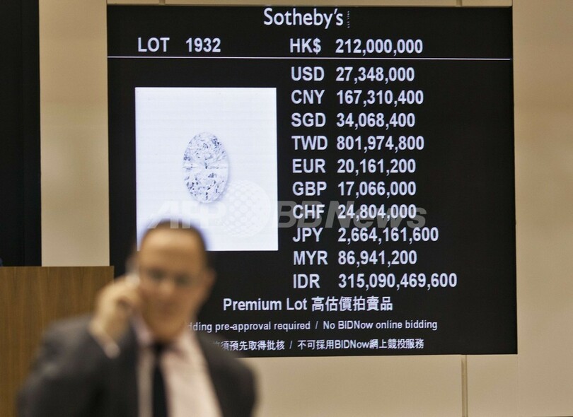 ニュース ライフ 118カラットのホワイトダイヤに史上最高額、香港 2013年10月8日 8:40 発信地:香港 このニュースをシェア ‹ › ❮ 4/7 ❯ 香港(Hong Kong)にて行われたオークションで、出品されていたホワイトダイヤが、新記録となる3060万ドル(約29億7000万円)で落札され、電話を取り出す観客の一人(左、2013年10月7日撮影)。(c)AFP/ANTHONY WALLACE 画像作成中 ! 【10月8日 AFP】118.28カラットを誇るホワイトダイヤが7日、香港(Hong Kong)で開催されたサザビーズ(Sotheby's)のオークションに出品され、新記録となる3060万ドル(約29億7000万円)もの値をつけた。輝くばかりのこのダイヤモンドは、オークションが開始されてから6分後、電話で参加していた匿名の入札者によって落札されたという。(c)AFP ライフ 一覧へ> メディア・報道関係・法人の方向け 写真・動画 購入のお問合せ>