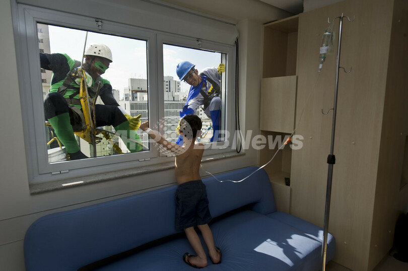 【10月11日 AFP】こどもの日を12日にひかえた南米ブラジル・サンパウロ(Sao Paulo)の小児病院で、スーパーヒーローの姿に扮(ふん)した作業員が窓ガラスの清掃を行う様子が見られた。ヒーローたちは、病室にいる子どもたちと窓ガラス越しに交流したり、励ます仕草を見せたりした。(c)AFP