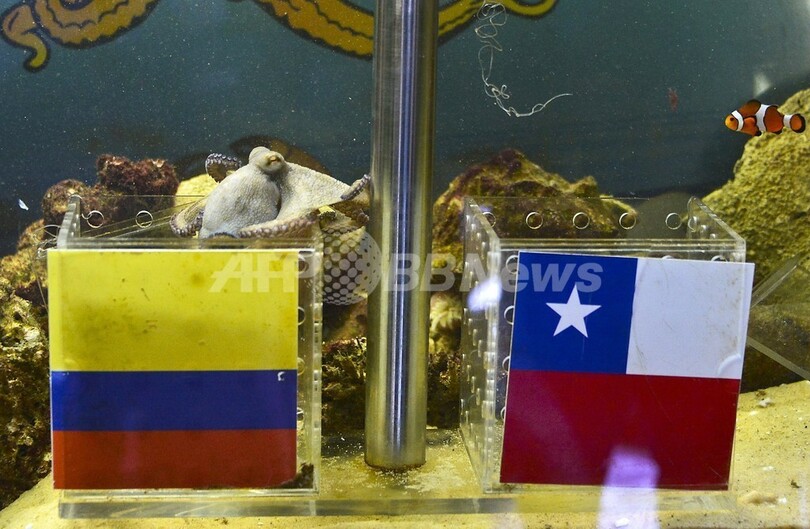 2010年のサッカーW杯南アフリカ大会(2010 World Cup)の結果予想で有名になったパウル(Paul)の新バージョンとも言えるこのタコは、南米予選のコロンビア対チリ戦の結果を占い、コロンビアの国旗が記された箱を選んだ。(c)AFP