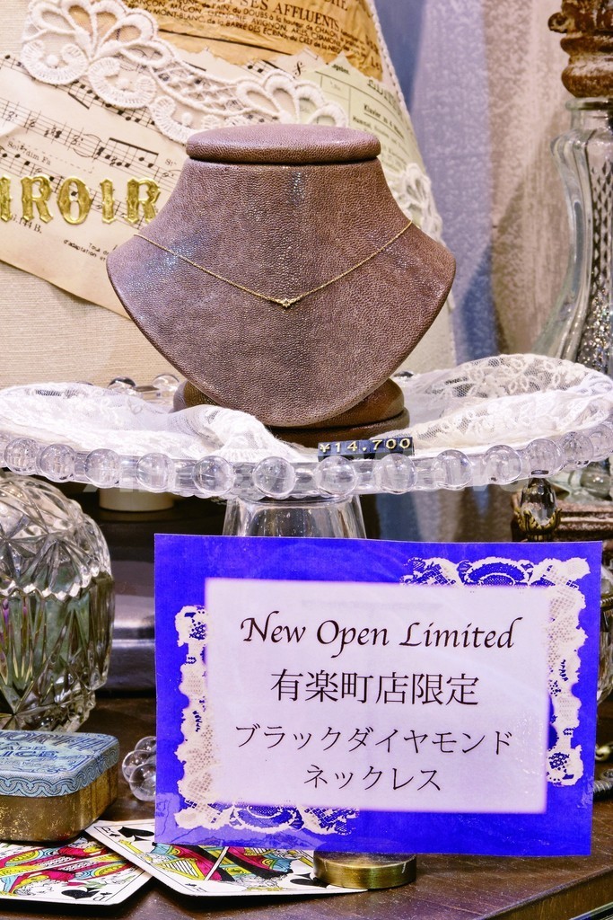 シャンデリアが輝くクラシカルな店内に並ぶのは、日本製のオリジナルの10Kジュエリー(中心価格1万~3万円)や天然石のアクセサリー(5000円前後)。新作ではガーネットやアメジストなど、深みのある秋色のカラーストーンを使ったアクセサリーがイチオシ。今シーズンは、インポートパーツから型を起こしたこだわりのデザインや職人の手仕事による線曲げ加工を施したピアスが充実している。ビンテージライクで繊細な細工が美しい「フィガロ・ビジュトゥリー」のジュエリーも並ぶ。 ショップ限定のアイテムとして、ブラックダイヤモンドを使ったネックレス(1万4700円)も販売中だ。