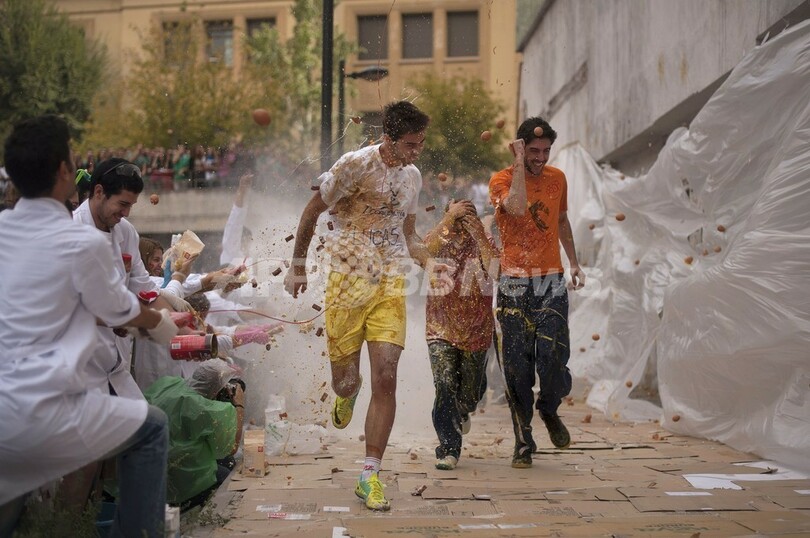 【10月18日 AFP】スペインのグラナダ大学(University of Granada)で17日、医学部の新入生たちに向かって在校生が一斉に飲食物を投げつける毎年恒例のイベントが開かれた。