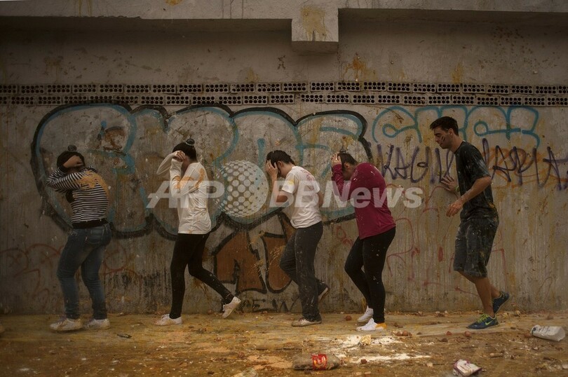 【10月18日 AFP】スペインのグラナダ大学(University of Granada)で17日、医学部の新入生たちに向かって在校生が一斉に飲食物を投げつける毎年恒例のイベントが開かれた。