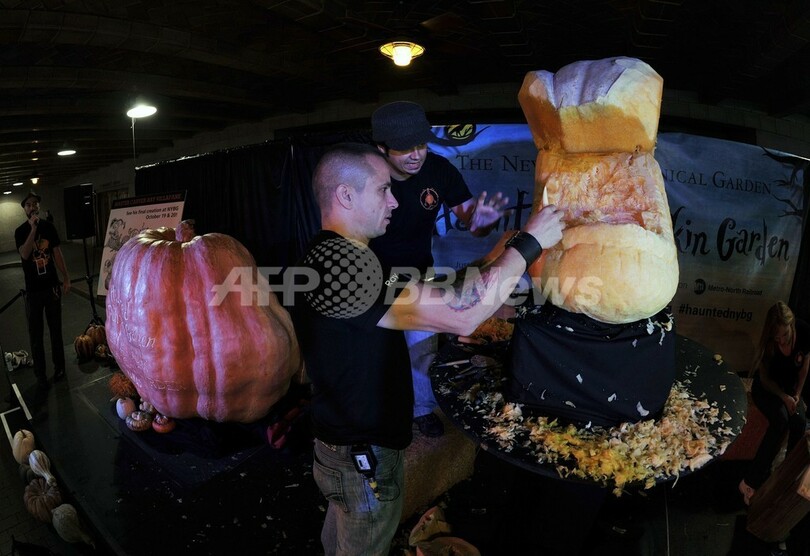【10月21日 AFP】ニューヨーク(New York)のグランド・セントラル駅(Grand Central Terminal)で18日、著名なパンプキン彫刻家のレイ・ビラファーネ(Ray Villafane)さんを中心とするチームが、823キロの大きなかぼちゃに彫刻を施す作業を実演した。巨大な食虫植物や不可思議な生き物たちをかたどった一連の作品は、ニューヨーク・ブロンクス(Bronx)にあるニューヨーク植物園(New York Botanical Garden)にて19日と20日に開催されるイベント「Giant Pumpkin Carving Weekend」のために作成された。(c)AFP