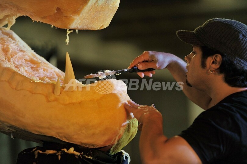 【10月21日 AFP】ニューヨーク(New York)のグランド・セントラル駅(Grand Central Terminal)で18日、著名なパンプキン彫刻家のレイ・ビラファーネ(Ray Villafane)さんを中心とするチームが、823キロの大きなかぼちゃに彫刻を施す作業を実演した。巨大な食虫植物や不可思議な生き物たちをかたどった一連の作品は、ニューヨーク・ブロンクス(Bronx)にあるニューヨーク植物園(New York Botanical Garden)にて19日と20日に開催されるイベント「Giant Pumpkin Carving Weekend」のために作成された。(c)AFP