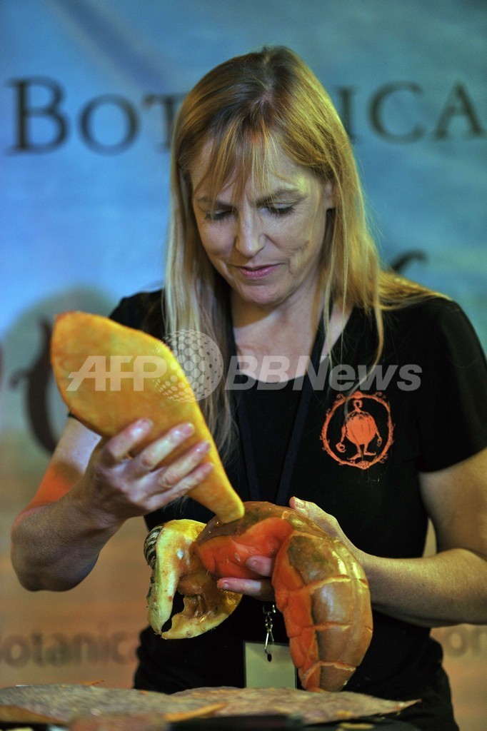 【10月21日 AFP】ニューヨーク(New York)のグランド・セントラル駅(Grand Central Terminal)で18日、著名なパンプキン彫刻家のレイ・ビラファーネ(Ray Villafane)さんを中心とするチームが、823キロの大きなかぼちゃに彫刻を施す作業を実演した。巨大な食虫植物や不可思議な生き物たちをかたどった一連の作品は、ニューヨーク・ブロンクス(Bronx)にあるニューヨーク植物園(New York Botanical Garden)にて19日と20日に開催されるイベント「Giant Pumpkin Carving Weekend」のために作成された。(c)AFP