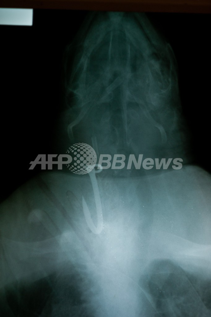 保護されたウミガメ2匹は、食道に釣り針が刺さっていた。エルサルバドル動物基金(Fundacion Zoologica de El Salvador)のボランティア医師が手術を行い、釣り針を取り除いた。(c)AFP