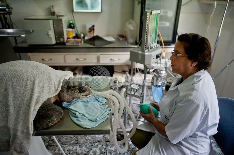 保護されたウミガメ2匹は、食道に釣り針が刺さっていた。エルサルバドル動物基金(Fundacion Zoologica de El Salvador)のボランティア医師が手術を行い、釣り針を取り除いた。(c)AFP