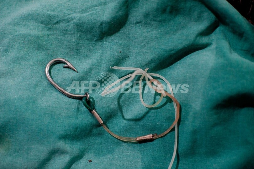 保護されたウミガメ2匹は、食道に釣り針が刺さっていた。エルサルバドル動物基金(Fundacion Zoologica de El Salvador)のボランティア医師が手術を行い、釣り針を取り除いた。(c)AFP