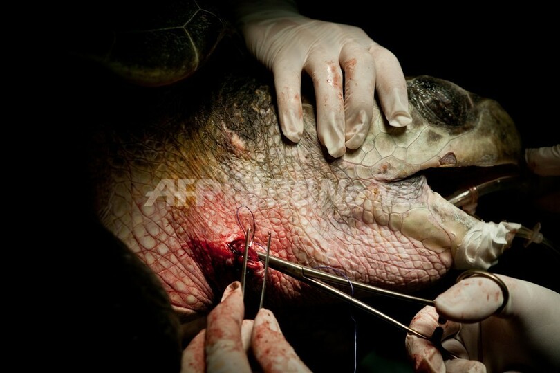 保護されたウミガメ2匹は、食道に釣り針が刺さっていた。エルサルバドル動物基金(Fundacion Zoologica de El Salvador)のボランティア医師が手術を行い、釣り針を取り除いた。(c)AFP