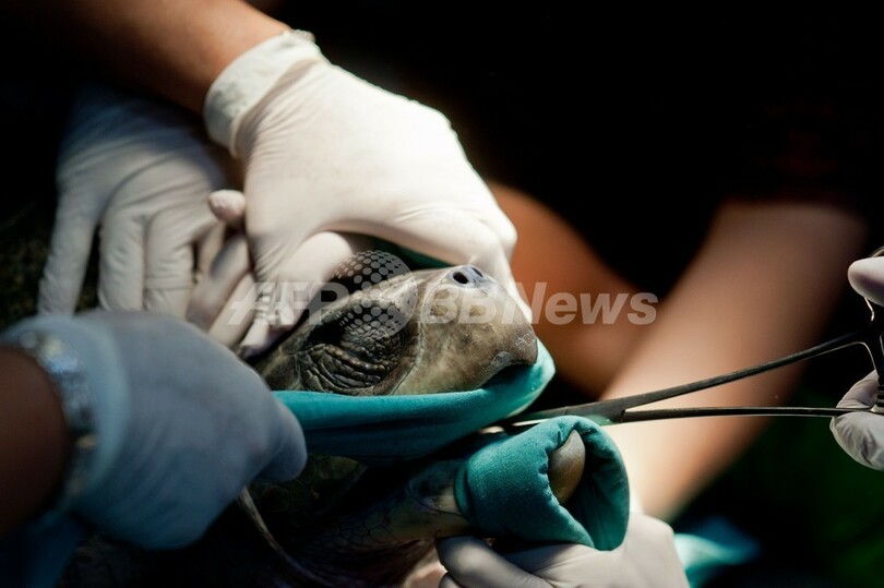 保護されたウミガメ2匹は、食道に釣り針が刺さっていた。エルサルバドル動物基金(Fundacion Zoologica de El Salvador)のボランティア医師が手術を行い、釣り針を取り除いた。(c)AFP