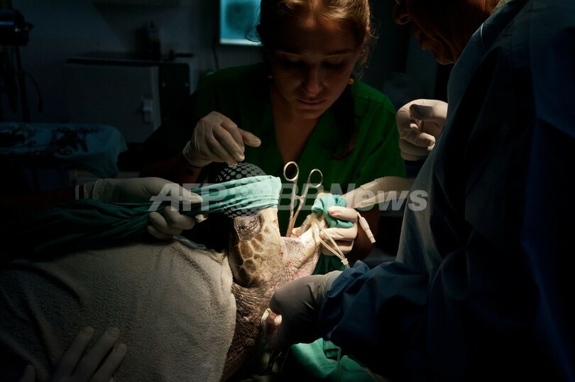 保護されたウミガメ2匹は、食道に釣り針が刺さっていた。エルサルバドル動物基金(Fundacion Zoologica de El Salvador)のボランティア医師が手術を行い、釣り針を取り除いた。(c)AFP