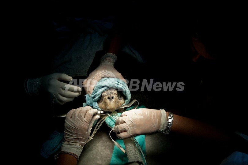 保護されたウミガメ2匹は、食道に釣り針が刺さっていた。エルサルバドル動物基金(Fundacion Zoologica de El Salvador)のボランティア医師が手術を行い、釣り針を取り除いた。(c)AFP