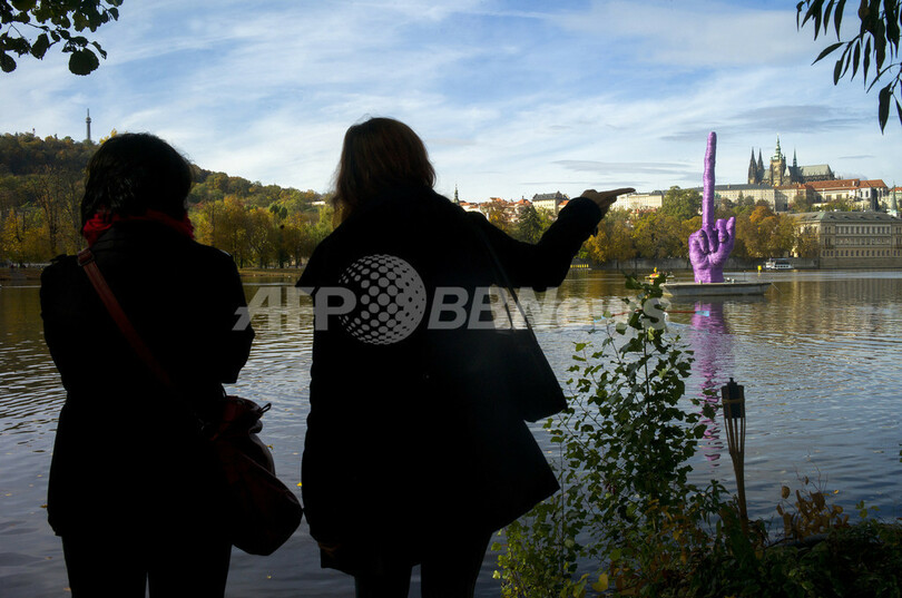 【10月22日 AFP】総選挙の投票を4日後に控えるチェコの首都プラハ(Prague)で21日、市内を流れるブルタバ川(Vltava River)の真ん中に、中指を立てた紫色の巨大な手の彫刻が登場した。この作品は、同国出身のアーティストのダビド・チェルニー(David Cerny)さんによって制作され、ミロシュ・ゼマン(Milos Zeman)大統領が居住するプラハ城(Prague Castle)の真向かいに設置された。(c)AFP